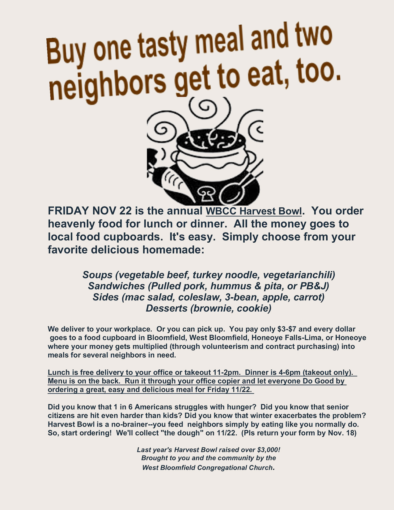 You order heavenly food for lunch or dinner, and all the money goes to local food cupboards. Simply choose from your favorite delicious homemade meals. We deliver to your workplace, or you can pick up.