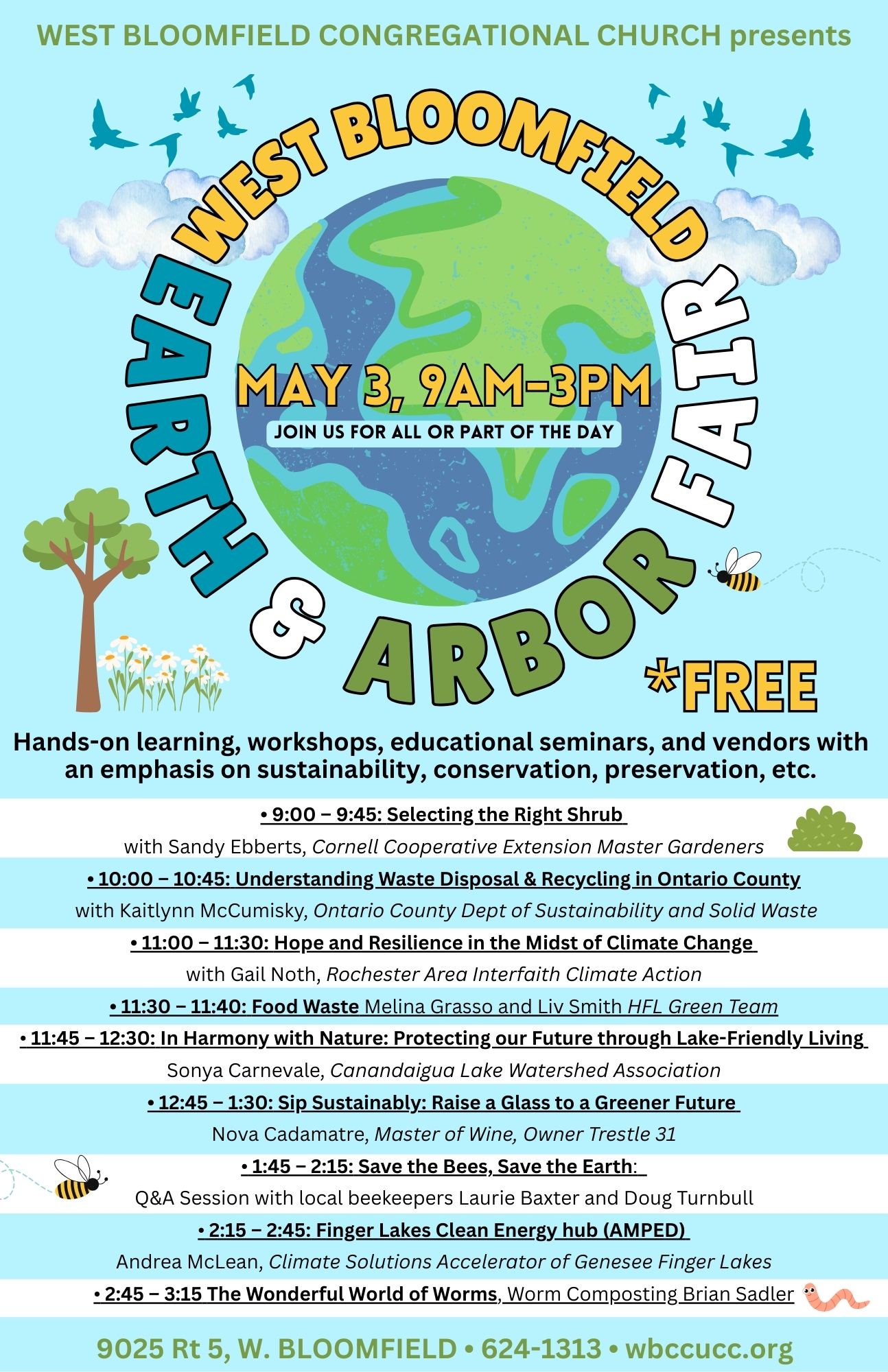 In addition to talks, enjoy exhibits, resources from local organizations, and hands-on learning opportunities. The West Bloomfield Earth & Arbor Fair is a celebration of Earth Day, Arbor Day, and the growing movement to live more sustainably. West Bloomfield Congregational Church is located at 9035 Rt 5 in W. Bloomfield.