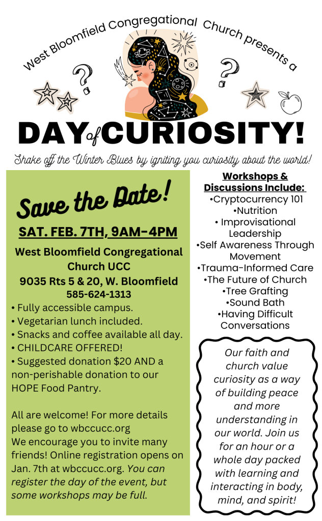 SHAKE OFF THE WINTER BLUES FOR A DAY (OR HOUR) TAKING A CURIOUS LOOK AT OUR WORLD! West Bloomfield United Church of Christ will hold our 4th Annual Day of Curiosity on Saturday February 6, 2026. In “the spirit of Chautauqua” WBUCC will honor its longstanding heritage of intellectual discernment and public entertainment by offering a “Day of Curiosity”. Day of Curiosity 2026